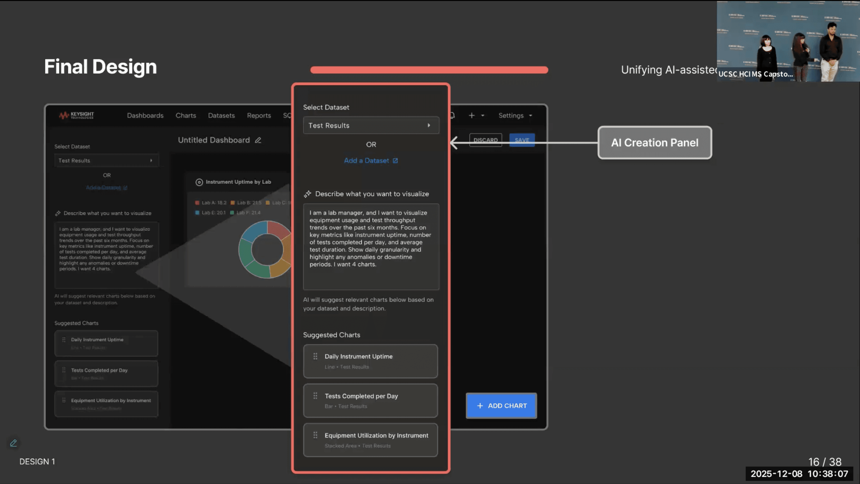 Ultimately, our research insights and design recommendations helped reframe how Keysight thought about AI in workplace tools: not as a replacement for expertise, but as a way to make workflows faster, more tailored, and more efficient while keeping humans in control.