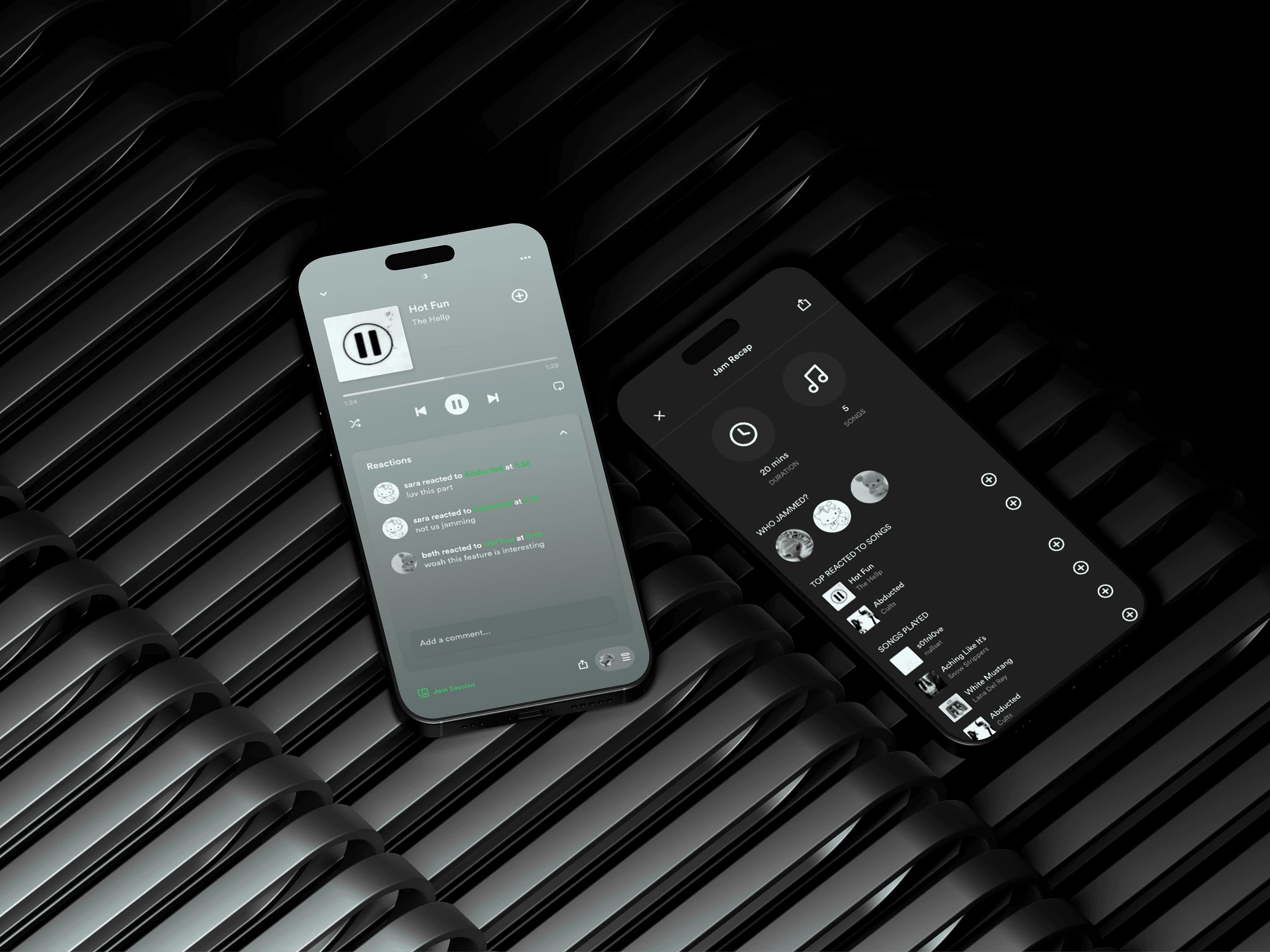 Spotify Jam enables synchronized listening but fails to support social expression during or after the session. Users can listen together, yet there is no native way to react in the moment, pushing communication to external apps. Additionally, after a session ends, it is lost forever with no shared artifact.